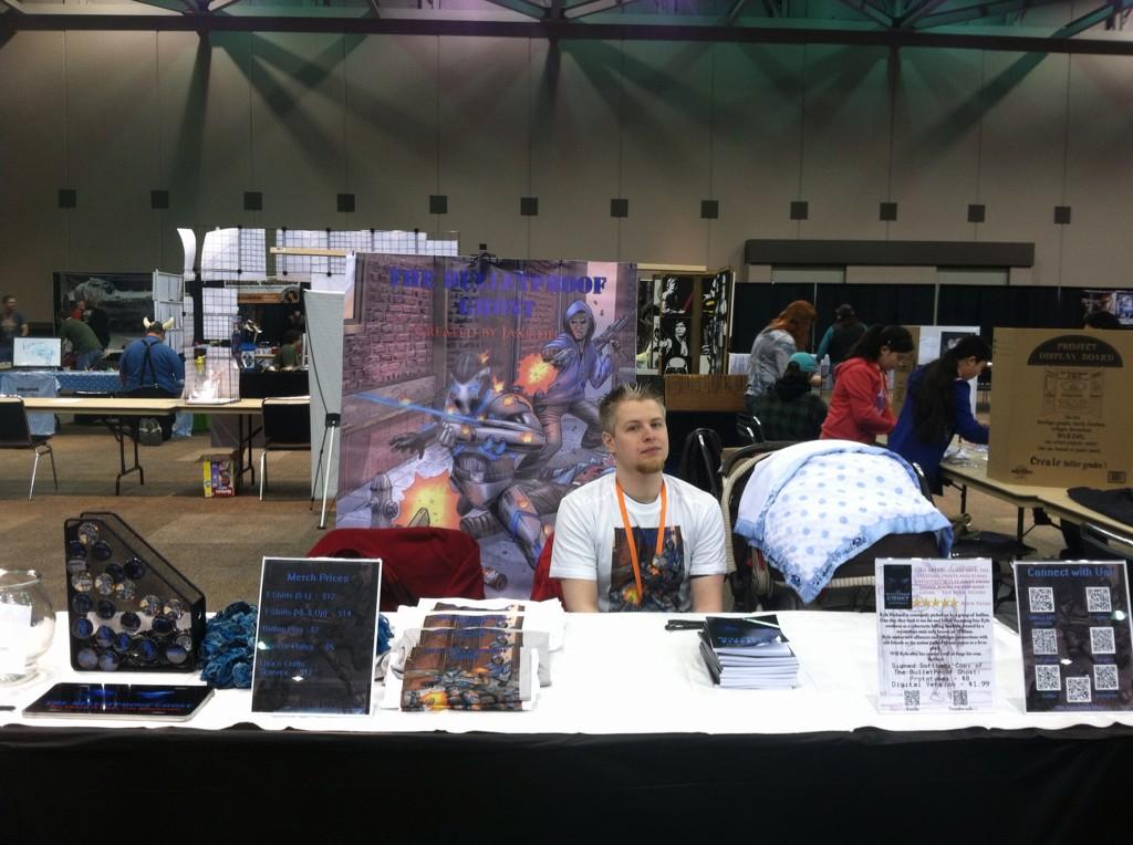 If you read this blog or frequent the Twitter feed, you'll know that last weekend, I took The BulletProof Ghost to Geek Galaxy. GG is a local comic convention, which is in its first year. The picture above shows my booth, which had all types of neat swag, including the actual novel, The BulletProof Ghost: Prototypes.